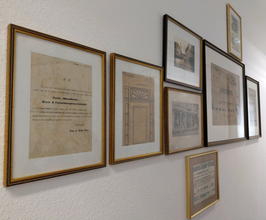 An die früher verkauften Waren und die alten Räumlichkeiten erinnern heute nur noch die historischen Dokumente, die in den Büroräumen des Familienbetriebs aushängen. Begeistert erzählte mir die Textilbetriebswirtin von den alten Fundstücken, die die Geschichte des Modehauses erzählen. So entdeckte sie beispielsweise noch alte Kaffeetüten, Portraits der vorherigen Inhaber und alte Fotos der Gebäude (siehe Bilderslider am Ende des Beitrags).
