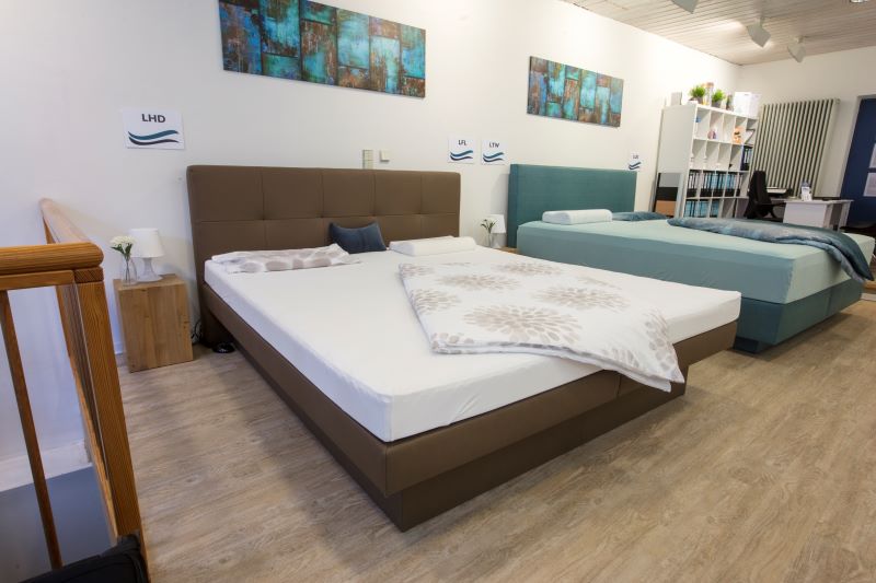 „Neu im Angebot haben wir eine Kombination aus Boxspringbett und Wasserbett. Wenn zum Beispiel nur ein Partner ein Wasserbett möchte, wird auf der einen Seite ein Wasserbett eingebaut und von außen völlig unsichtbar auf der anderen Seite ein Boxspringbett. So können wir auf den jeweiligen Schläfer ganz genau eingehen und jede Seite für sich individualisieren, sodass beide einen guten Schlafkomfort haben.“